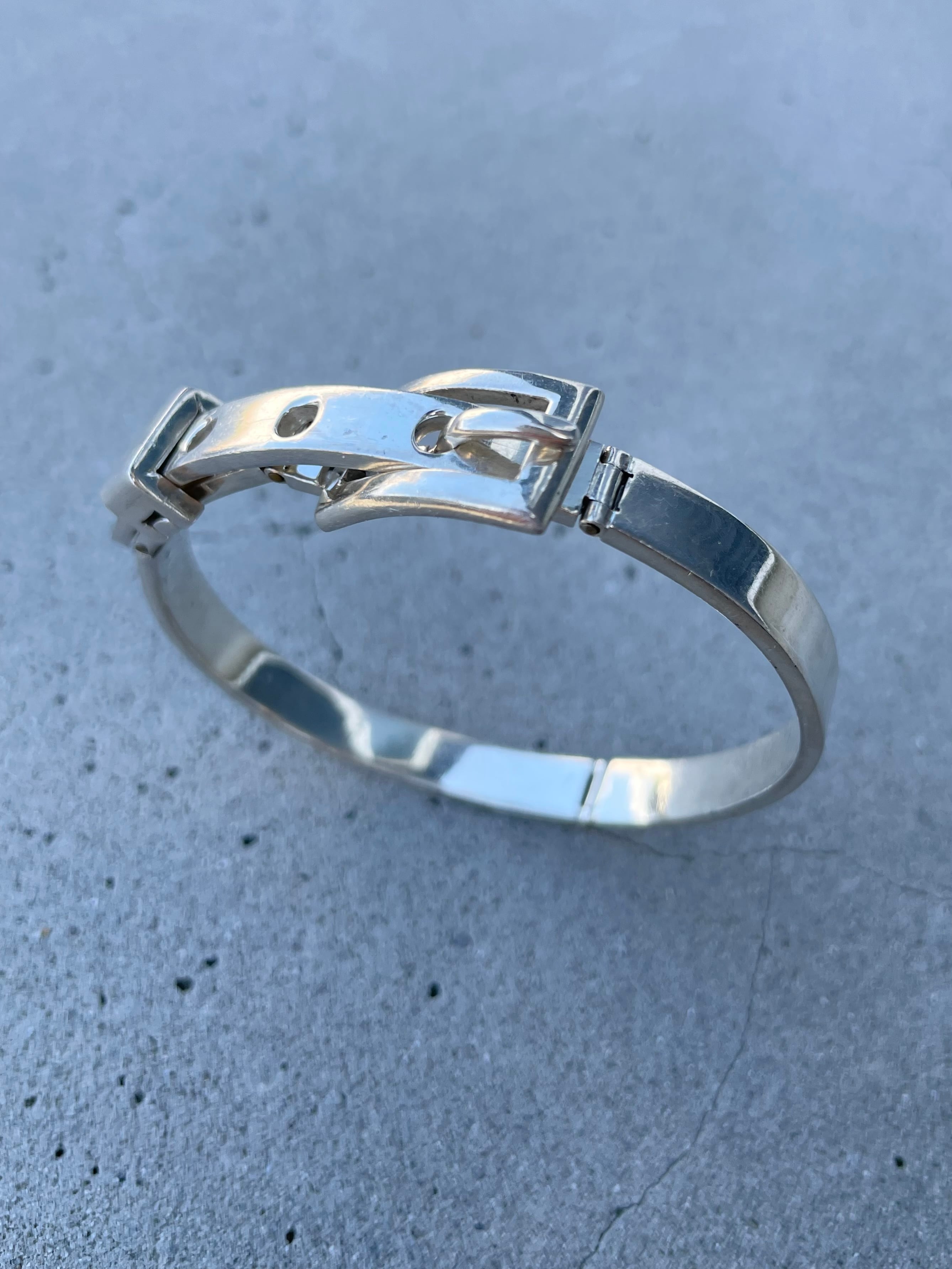 ヴィンテージのメキシコシルバーのブレスレット。バックルタイプは初入荷です。3穴のうち、内側から2穴でサイズ調整が可能です。男女ともに選ばれるアイテム。シルバーの聖地、タスコ製の刻印もあり目立ったダメージはありません。
