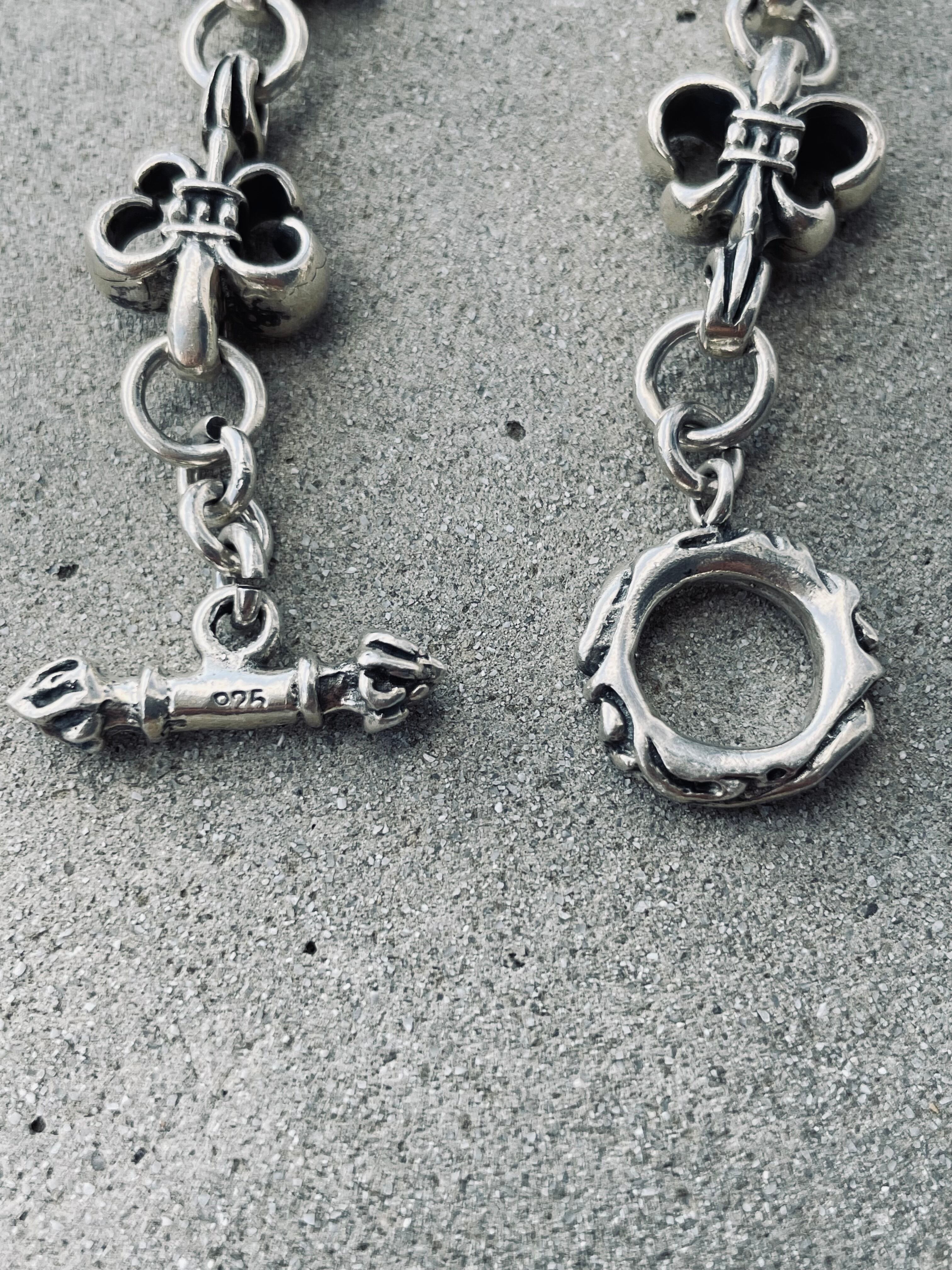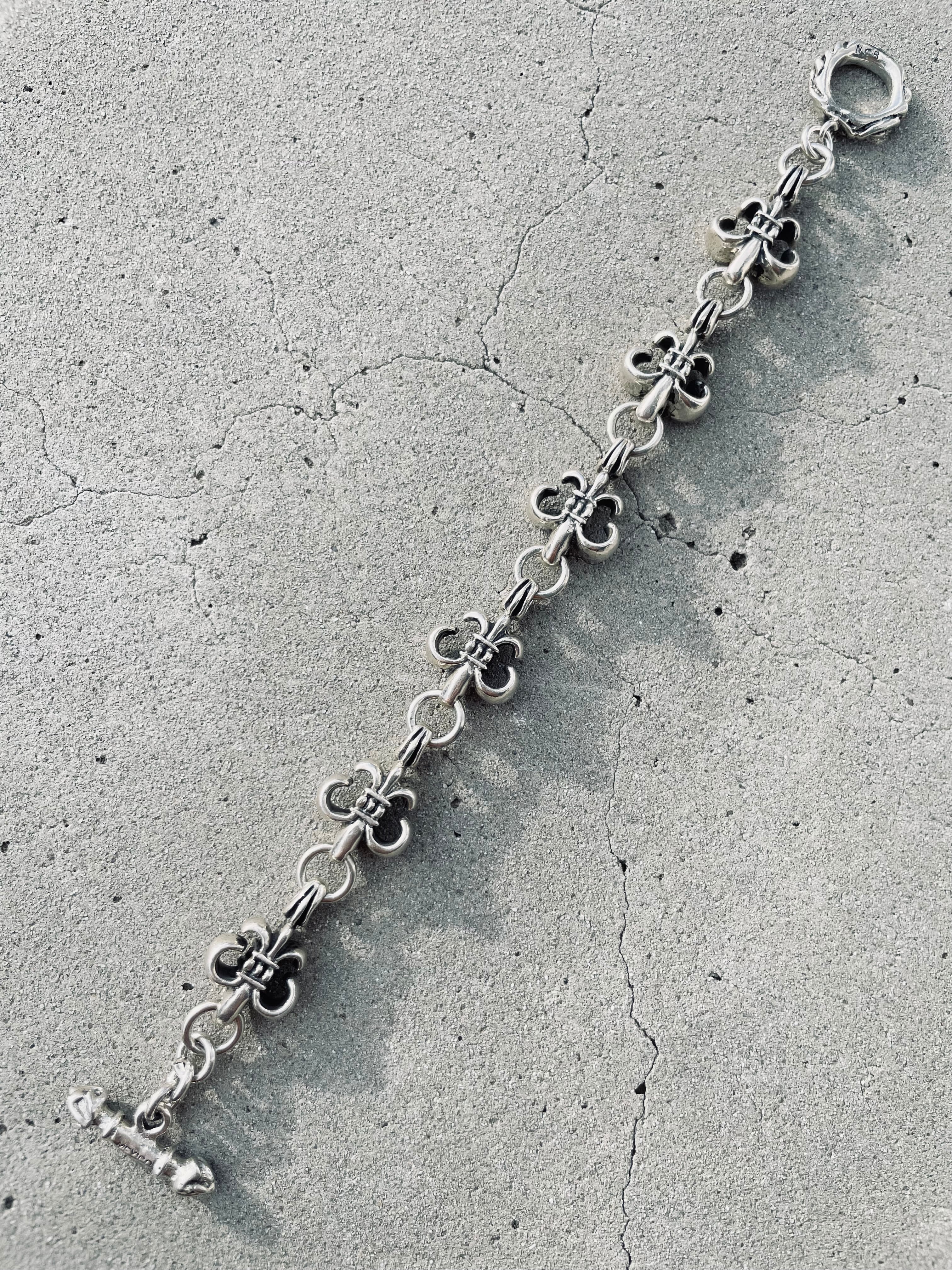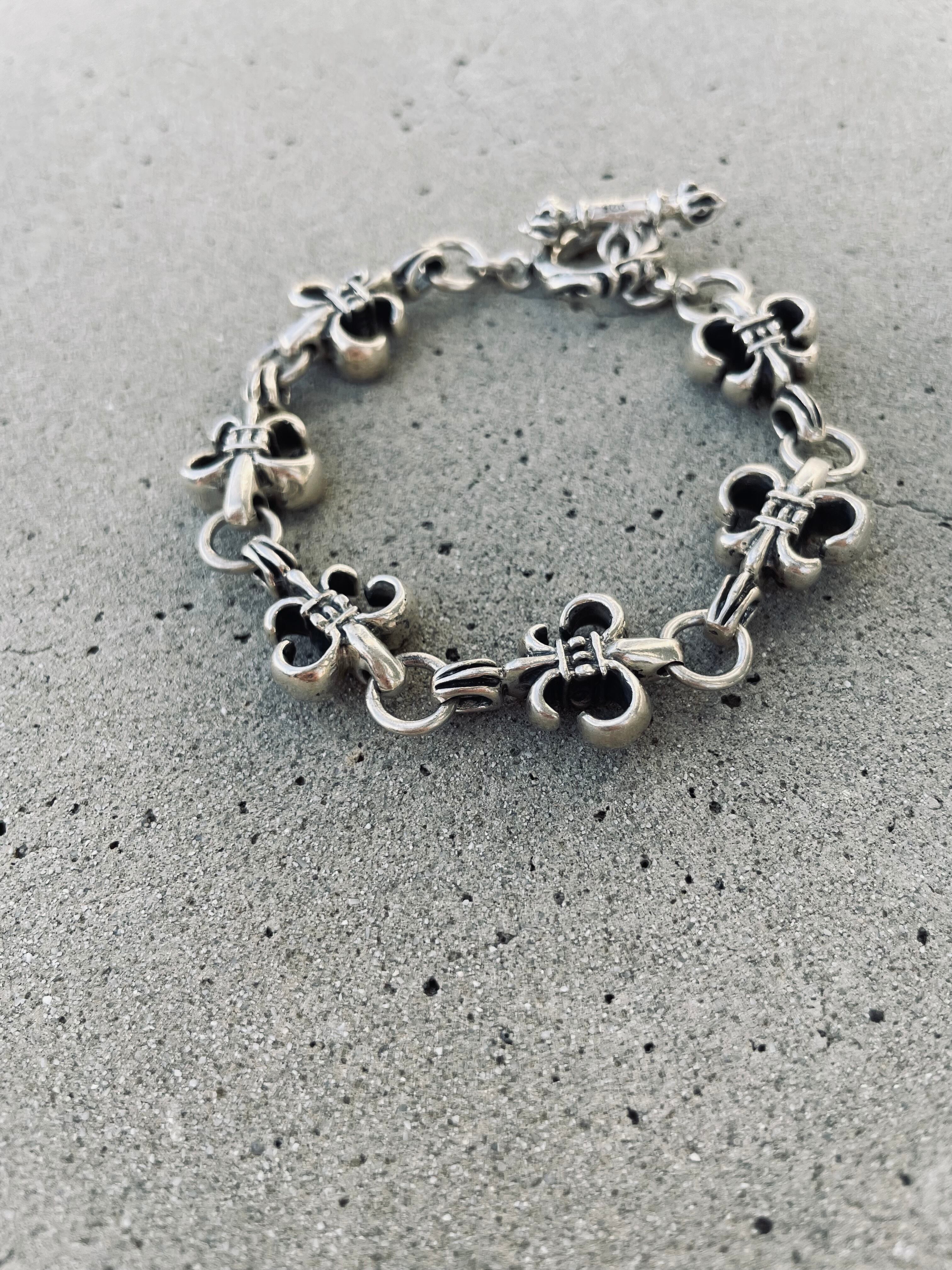ヴィンテージのメキシコシルバーのブレスレット。待望のFleur De Lisデザインが入荷いたしました。独特のロックな力強さと百合の紋章の気高さは語るまでもなく、非常に状態の良い魅力的なヴィンテージです。