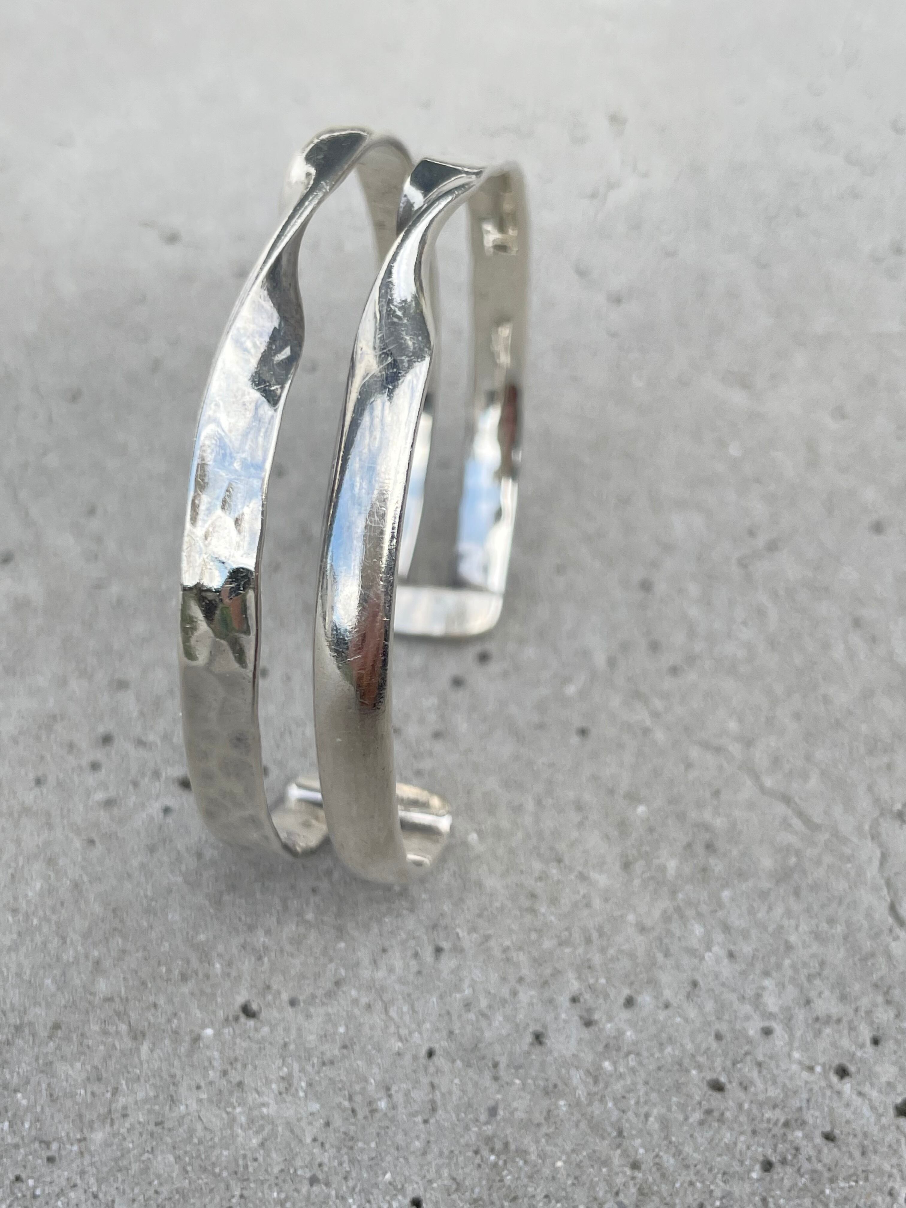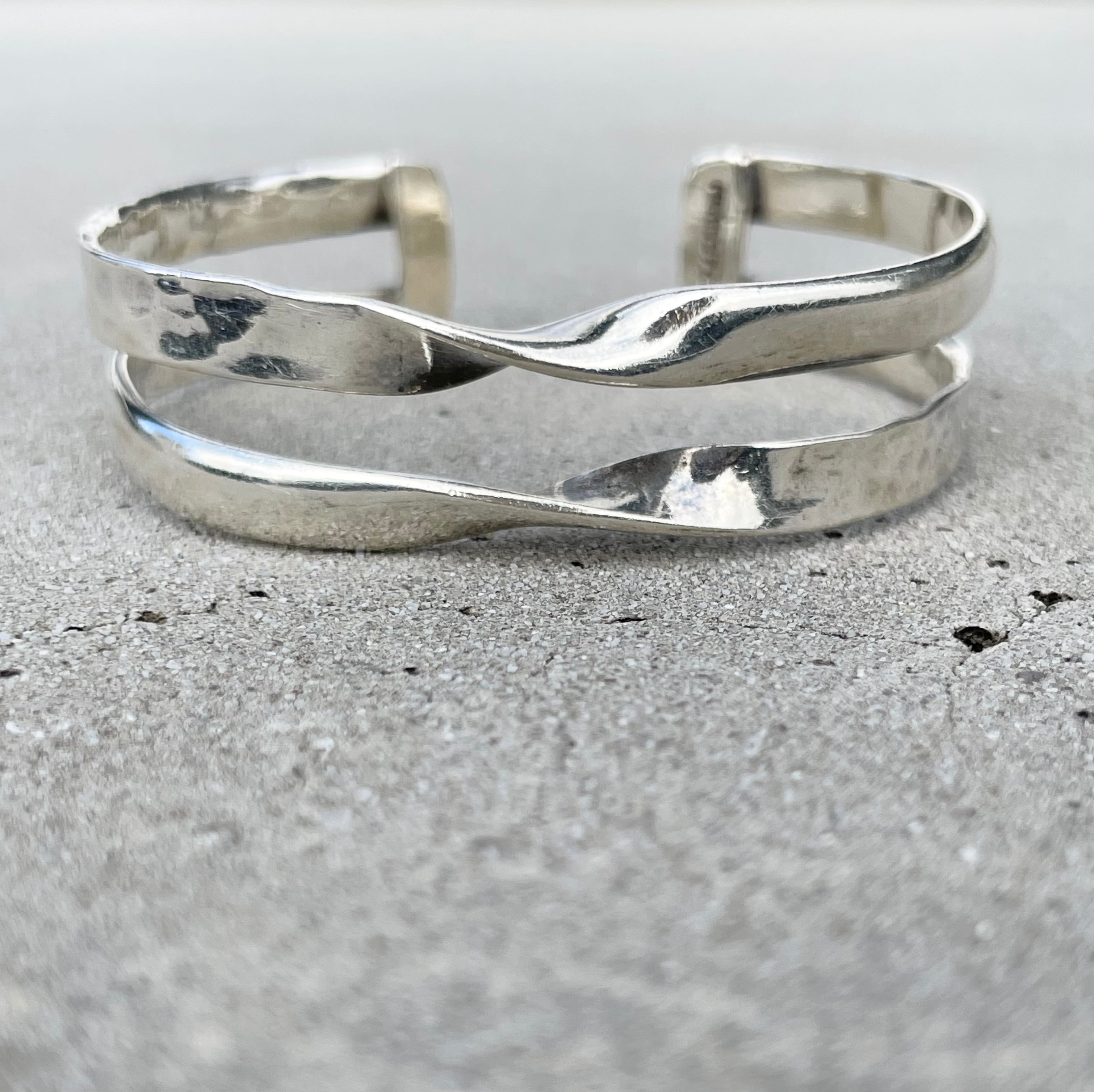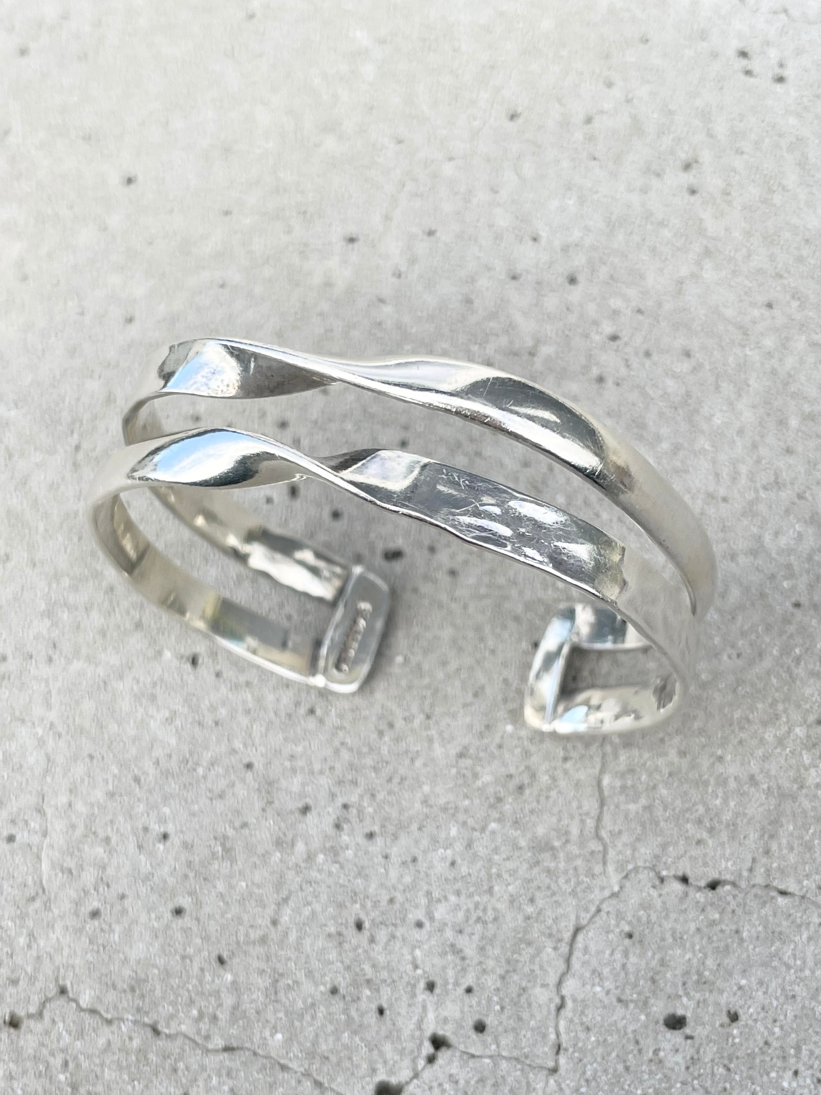 ヴィンテージのメキシコシルバーのバングル。連なる2本のツイストされたループ。左右非対称に異なる表面加工が施されています。艶やかな部分と打たれた部分、こだわりが詰まった逸品です。刻印もあり、状態は良好です。