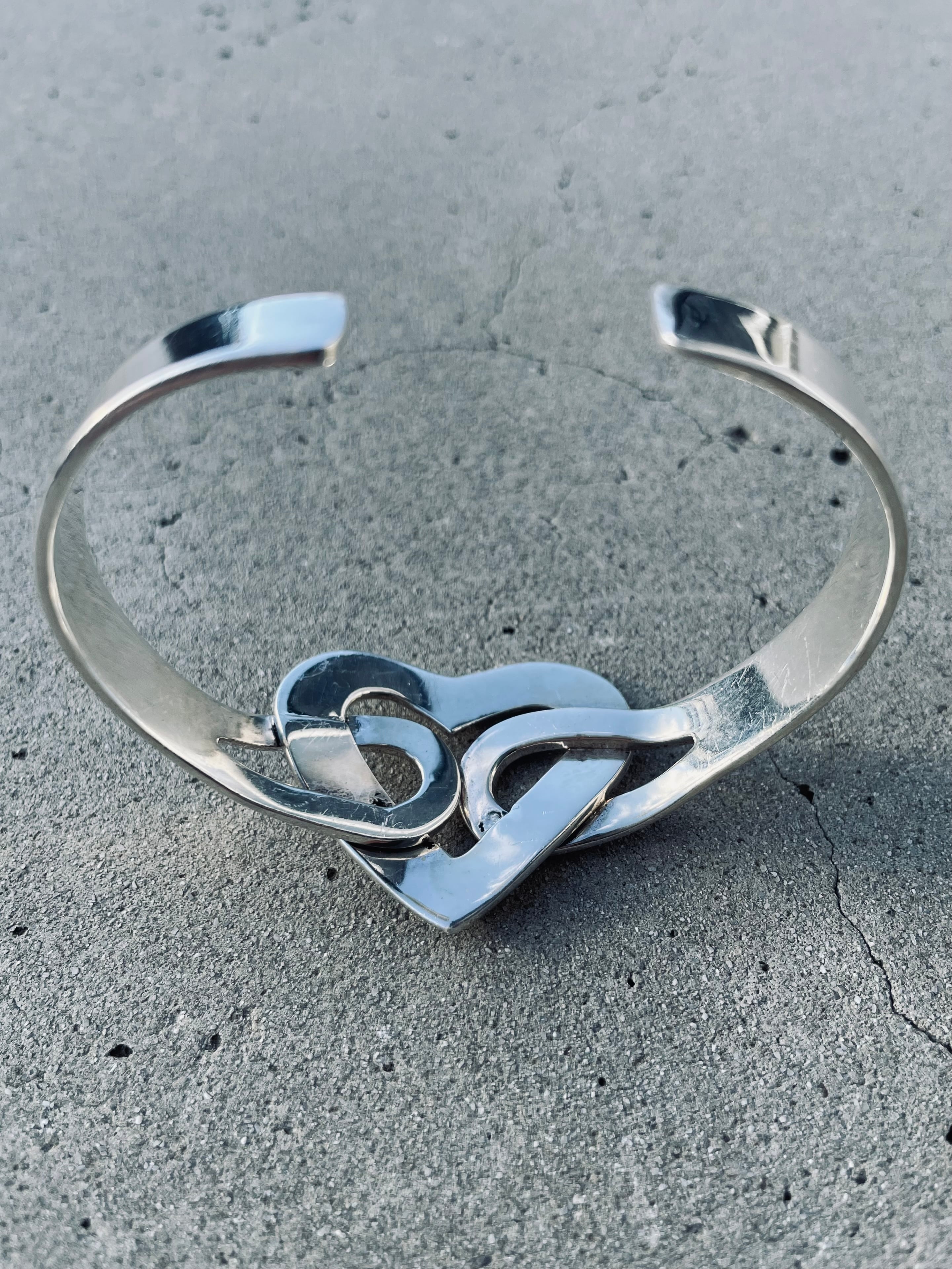 ヴィンテージのメキシコ、タスコシルバーのバングル。一際目を惹くハートの愛らしさと、ヴィンテージの格好良さが大人可愛いの基本を体現しています。刻印もあり、状態は良好です。