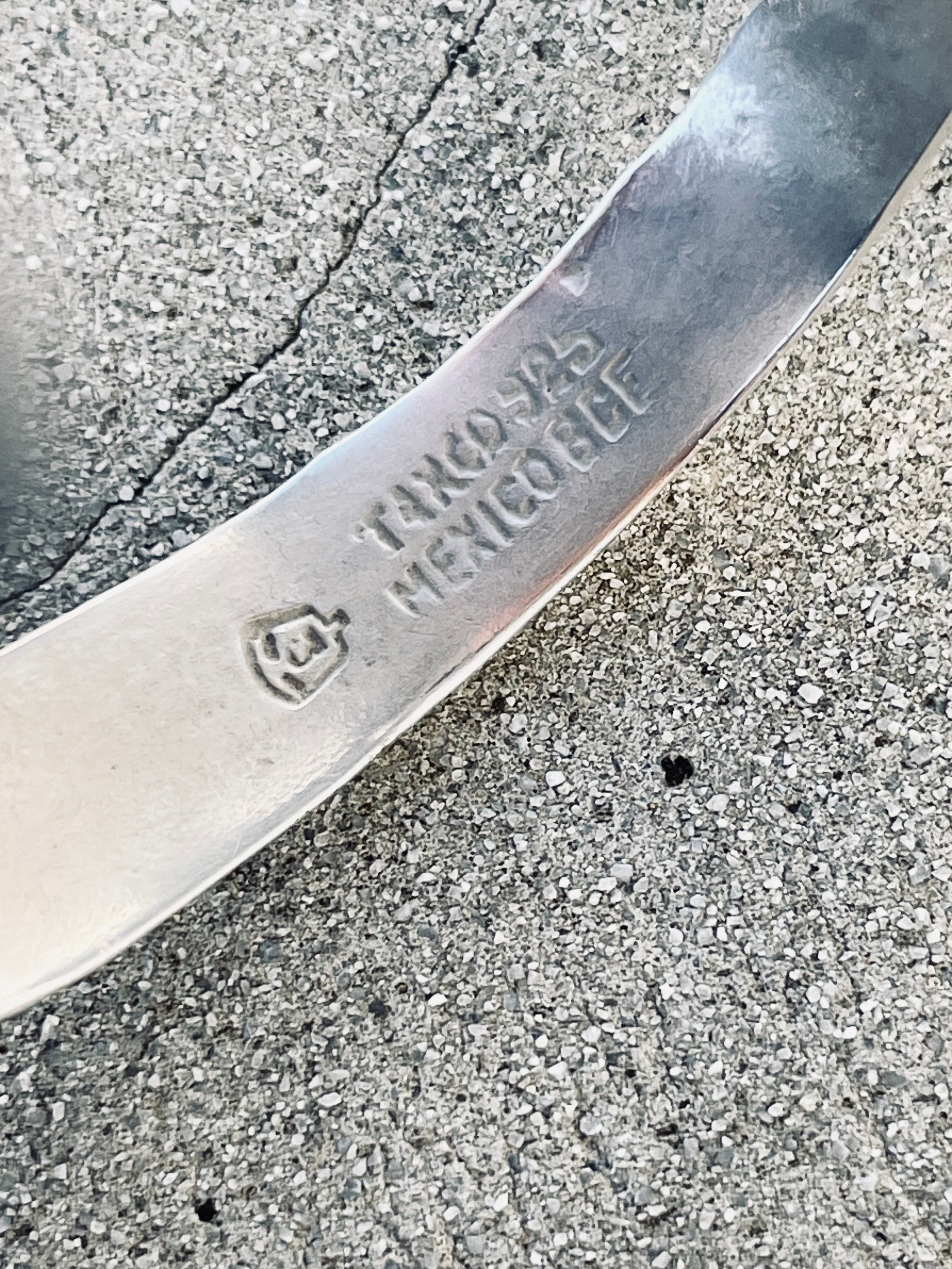 ヴィンテージのメキシコ、タスコシルバーのバングル。大変な年代物を表すイーグルマーク付きの逸品。アーティスティックなデザインは現代においても光輝きます。刻印もあり、状態は良好です。