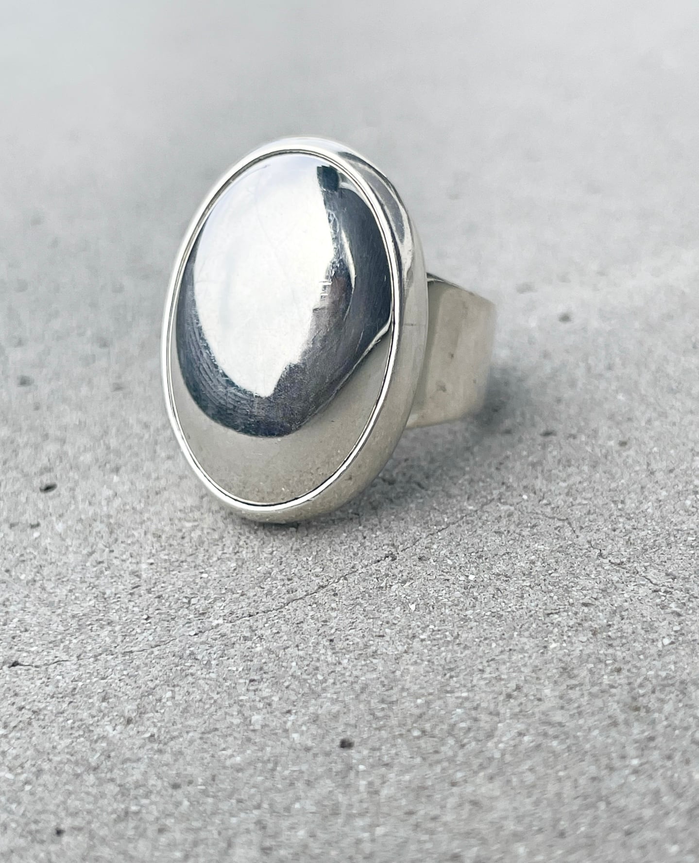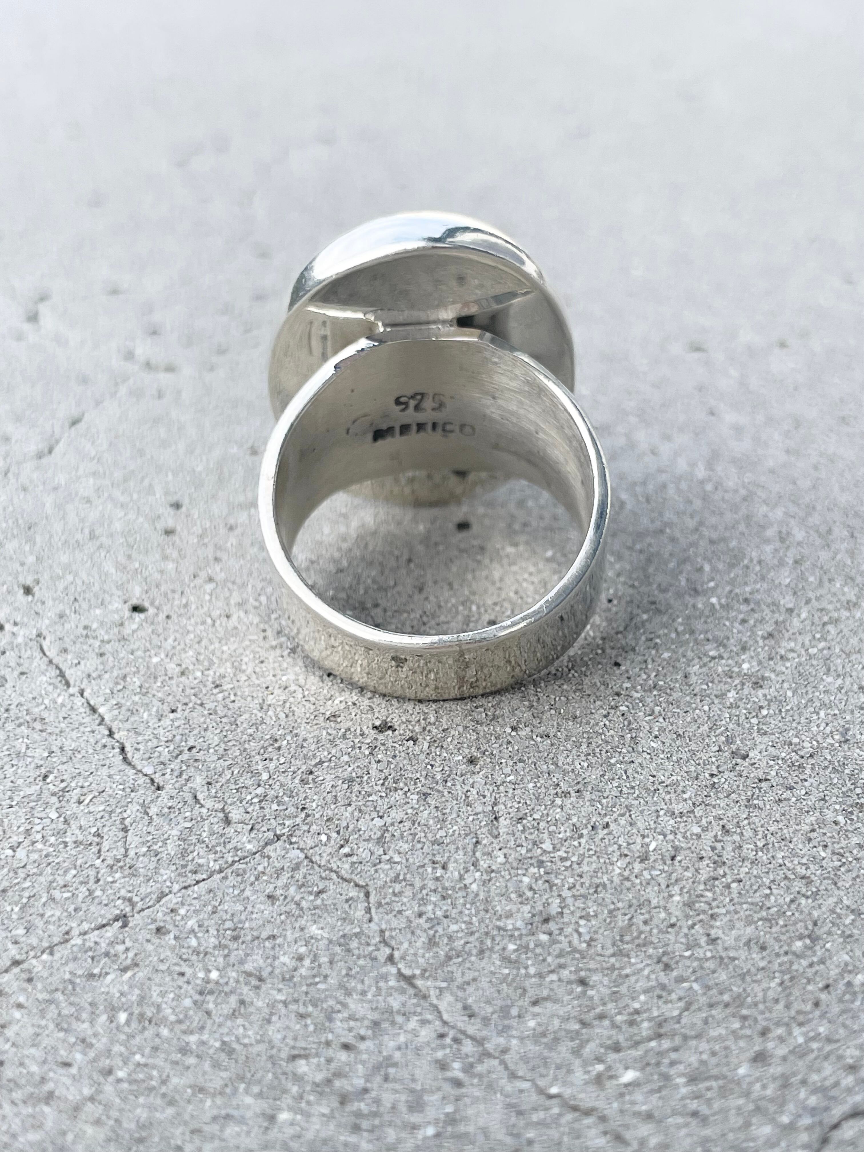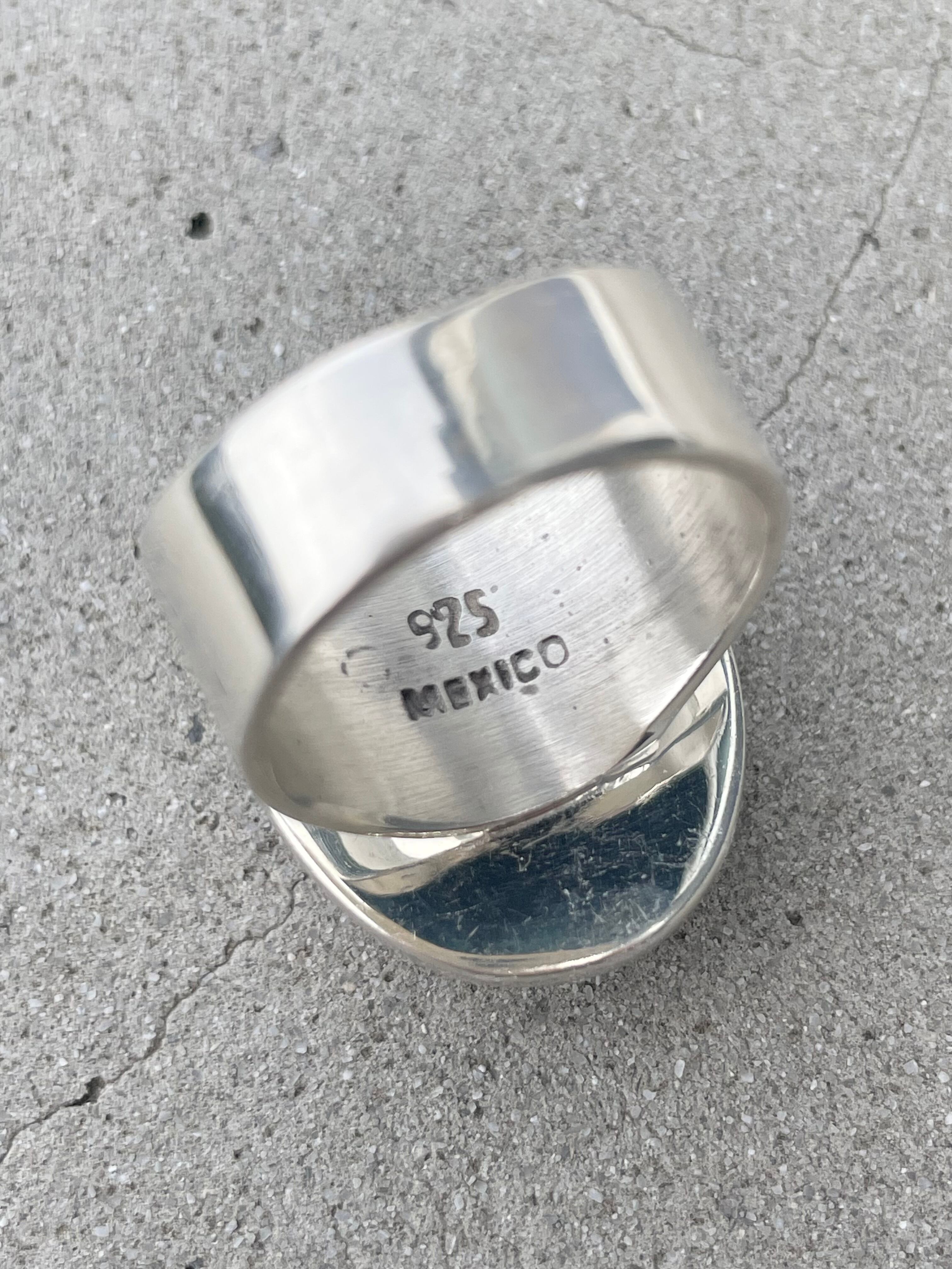 ヴィンテージのメキシコシルバーのリング。ボリュームあるオーバルデザインで、バンドリングのような幅広タイプ。刻印もあり、着用に差し支えるような傷はみられず状態は良好です。
