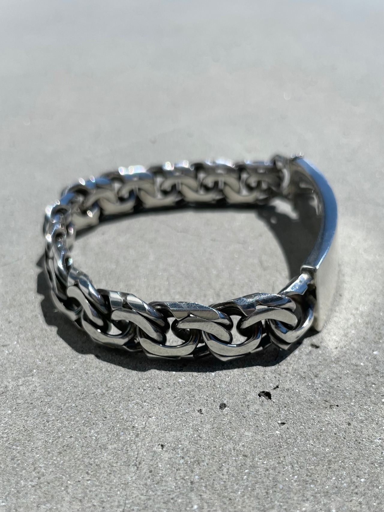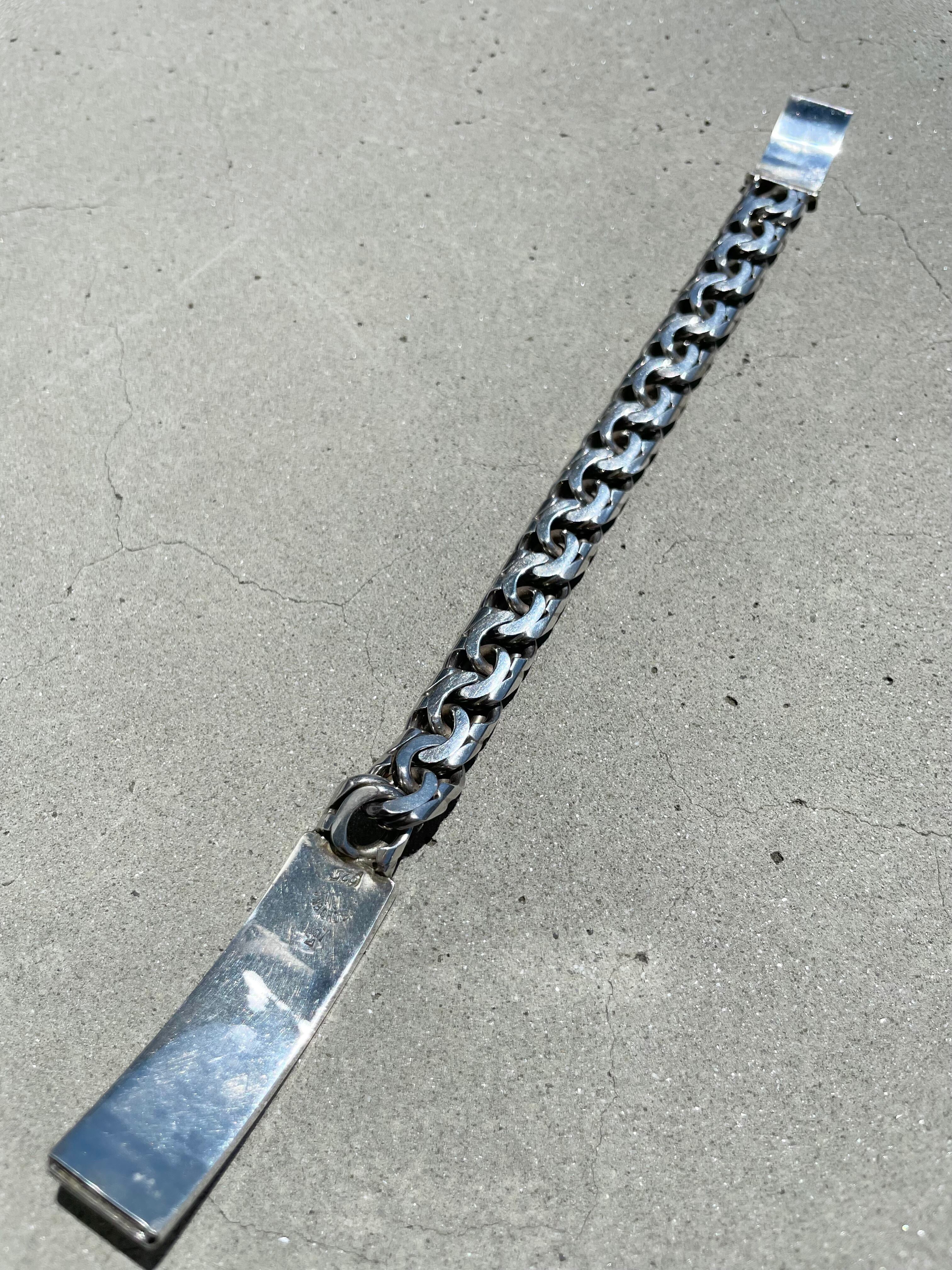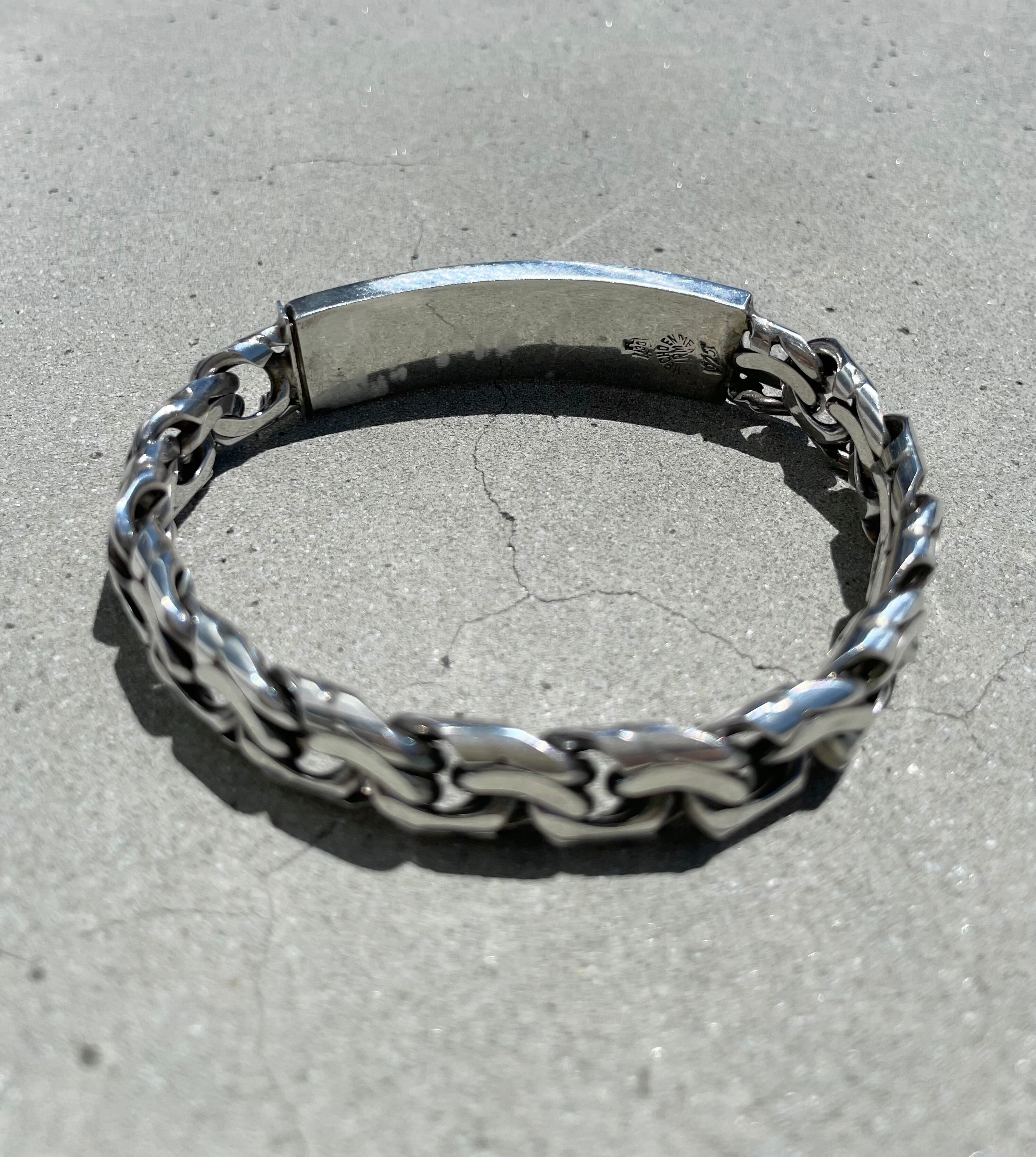 メキシコシルバーのヴィンテージブレスレット。入手困難なIDブレスレットです。重厚感は申し分ありません。刻印には年代物を表すイーグルマークも確認でき、このレベルのアイテムは次にいつ仕入れられるかわからないほど。大きなダメージなく状態は良好です。