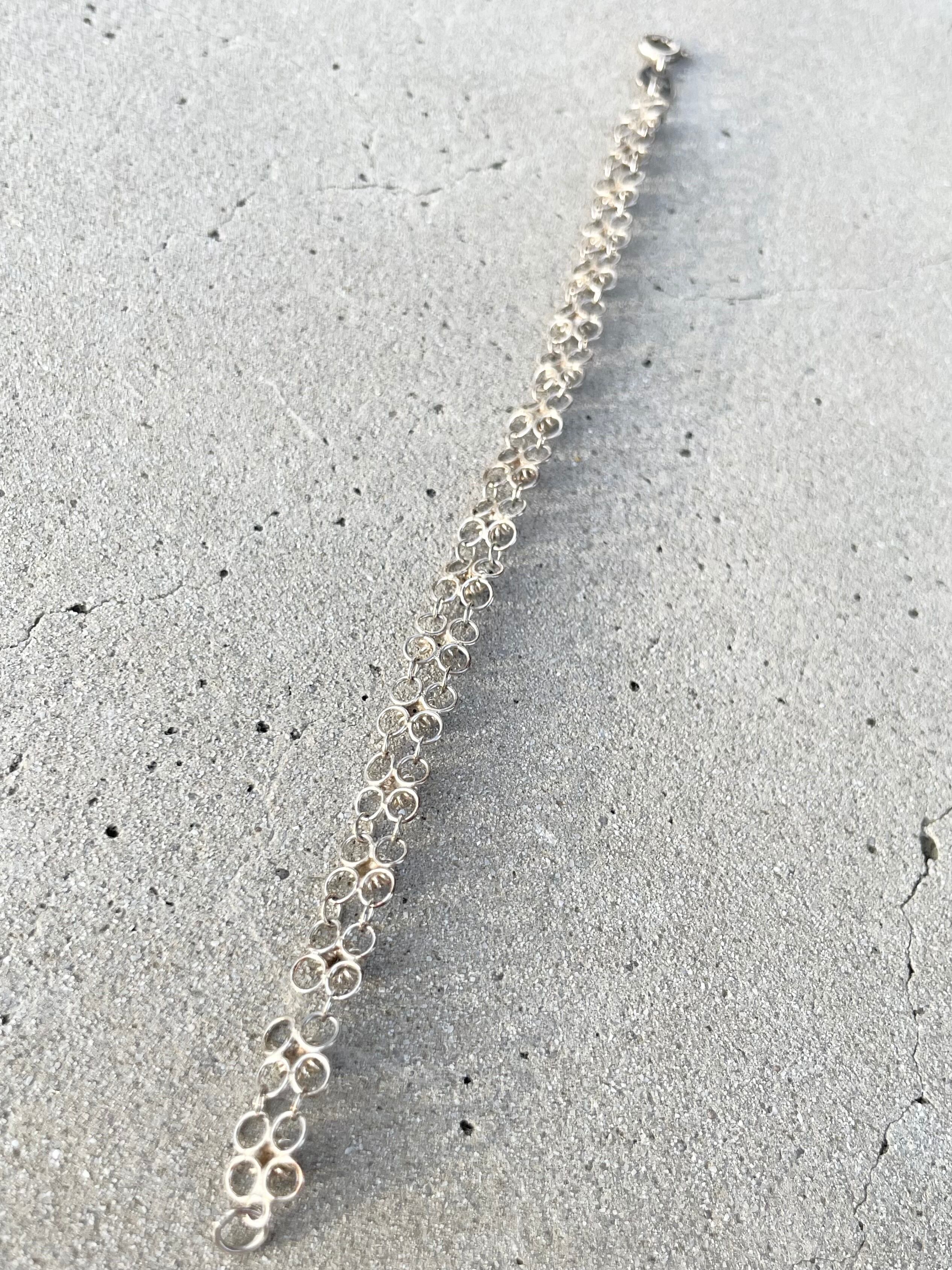 ヴィンテージのメキシコシルバーのブレスレット。フラワーモチーフをチェーンに落とし込んだ、繊細な作りと儚いヴィジュアル。ノスタルジックな秋冬のスタイリングに欠かせないアイテムです。留め具付近に添えられたさりげないハートがまた、乙女ゴコロをくすぐります。