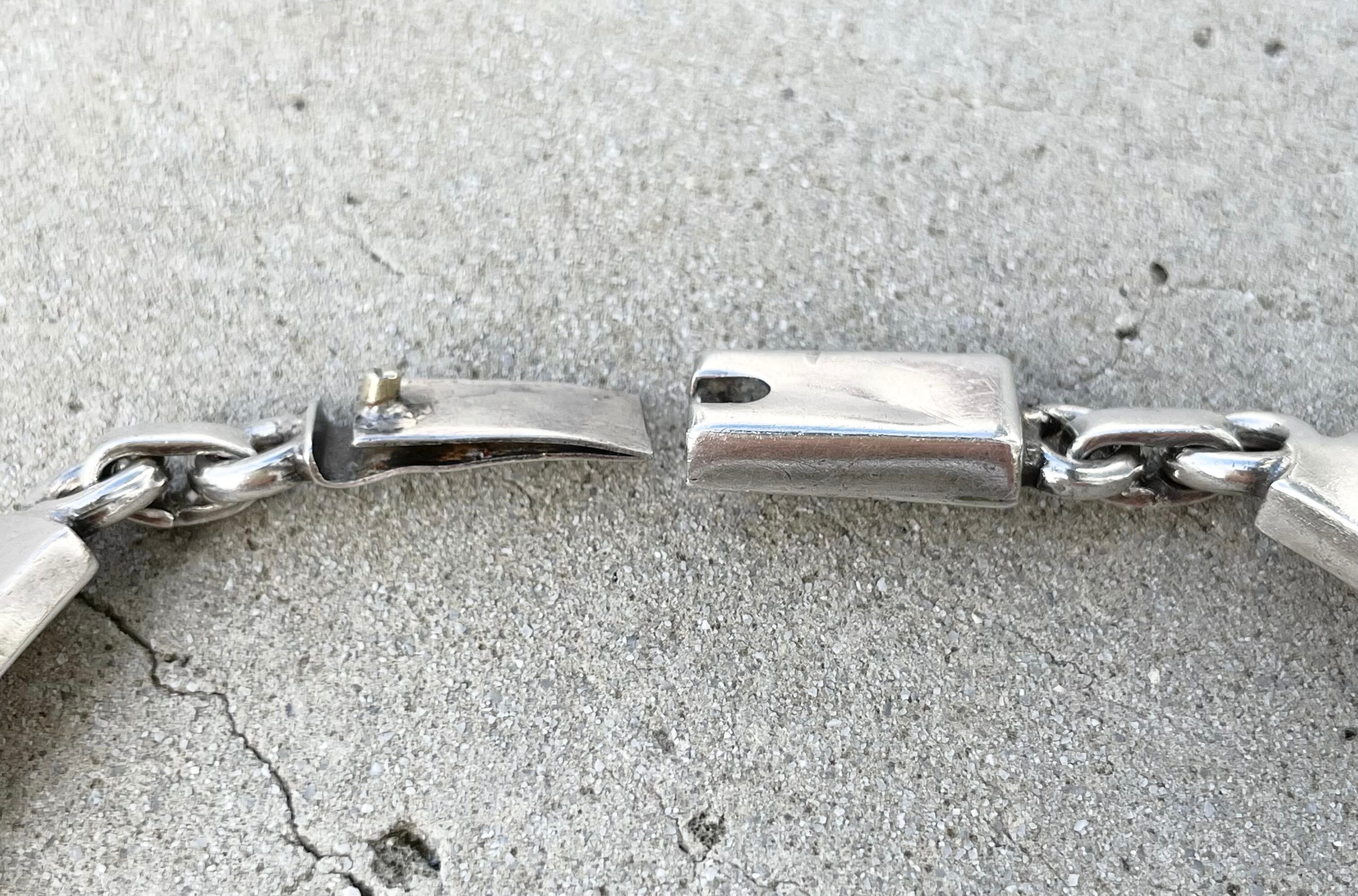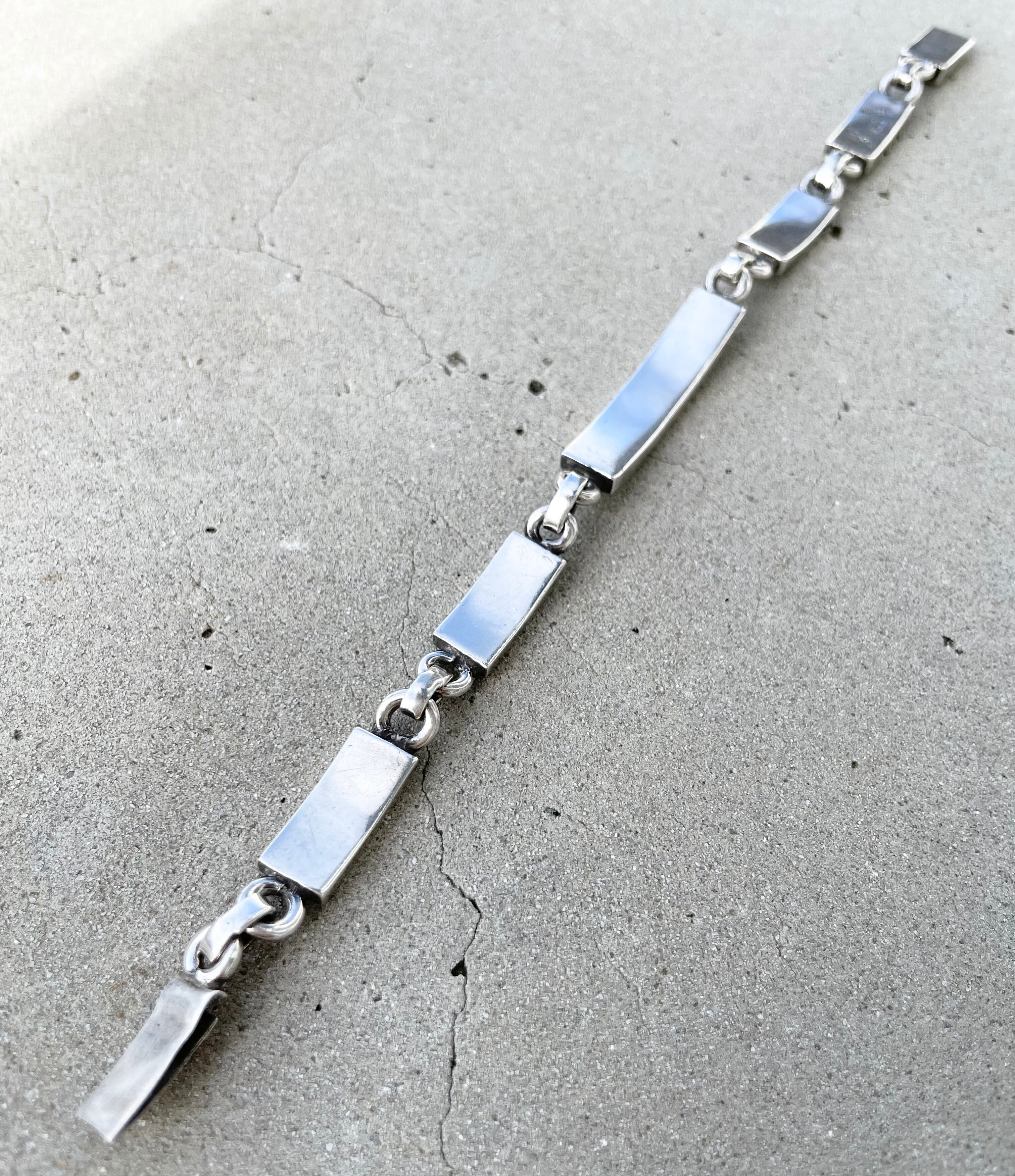 ヴィンテージのメキシコ、タスコシルバーのブレスレット。長方形のシルバーチェーンと中央に埋め込まれたターコイズがモードで洗練された印象。刻印もあり大きなダメージなく状態は良好です。