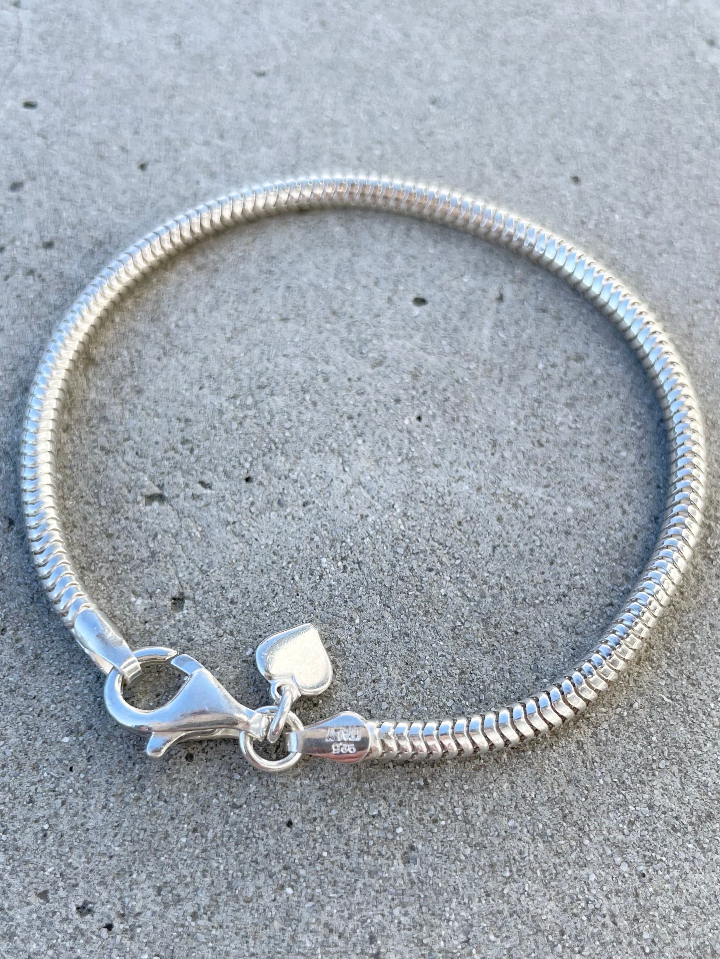 ヴィンテージのイタリアシルバーのブレスレット。スネークチェーンでも丸みを帯びたロープタイプ。イニシャルMが入ったハートチャームつきで、ご自身や大切な誰かでも。中細身、刻印もあり目立った傷はみられず状態は良好です。